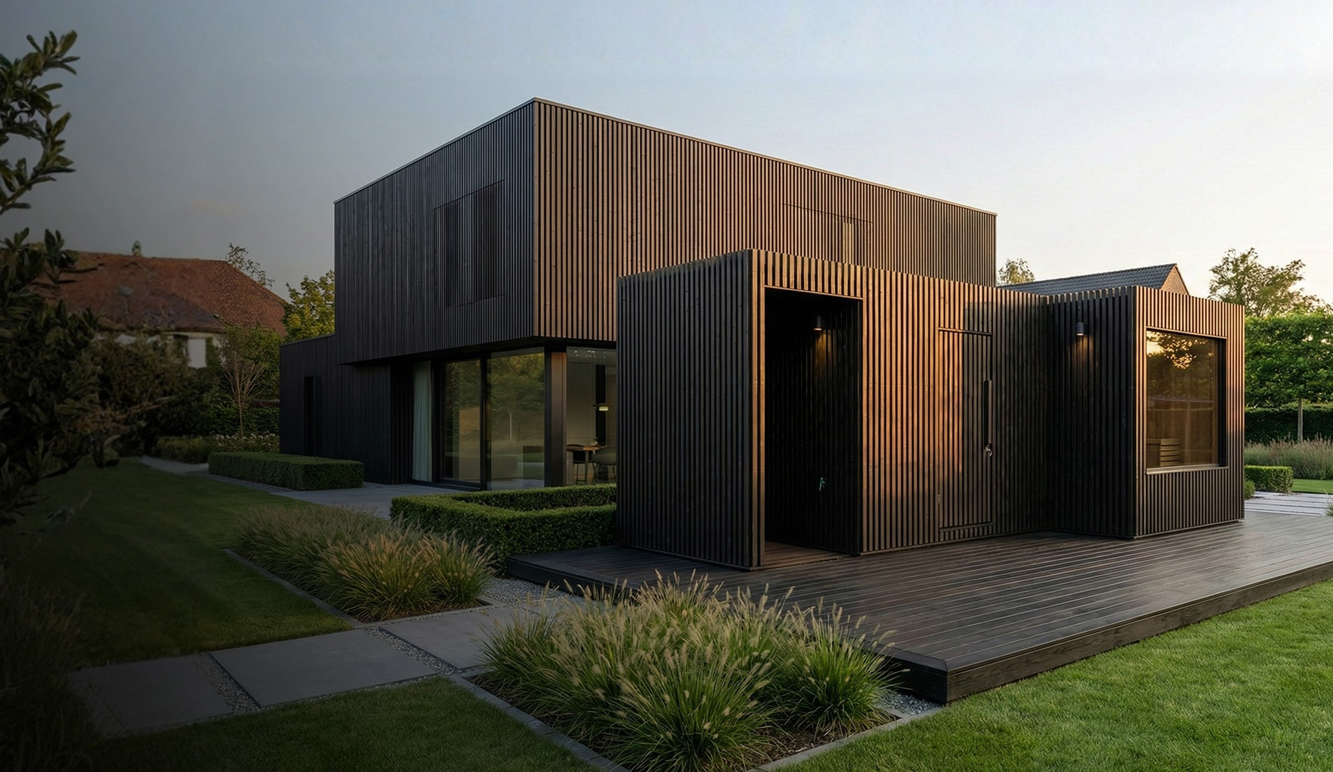 4,5 m Fasssauna in Thermoholz in Schwedenrot, mit Vorraum, halben Panoramafenster und überdachter Außenterrasse
